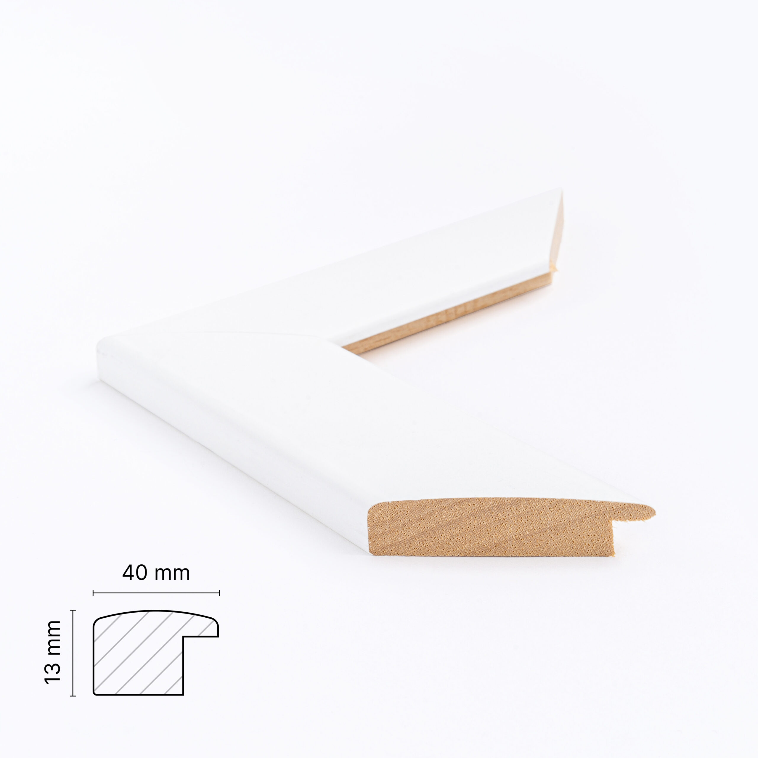 Denne rammeprofil som måler 40 mm på forsiden og 13 mm i dybden sælger vi til rammer fra str. 70×100 cm og helt op til str. 100×140 cm