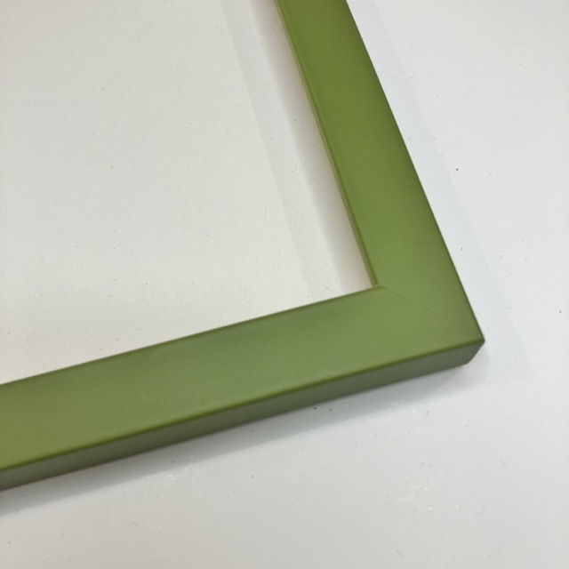Grøn træramme – nærmest olivenfarvet. Mat i farven og firkantede lister. Rammen er en smal tykkelse og måler 15 mm på forsiden og 15 mm i dybden. Rammen er fremstillet af træsorten Durian. Det er en træsort der producerer frugt, og først efter 30-35 år fældes til brug for eksempelvis møbler og lister. Træet dyrkes oftest i plantager, så man hele tiden sikre, at man ikke bruger mere træ end der plantes.