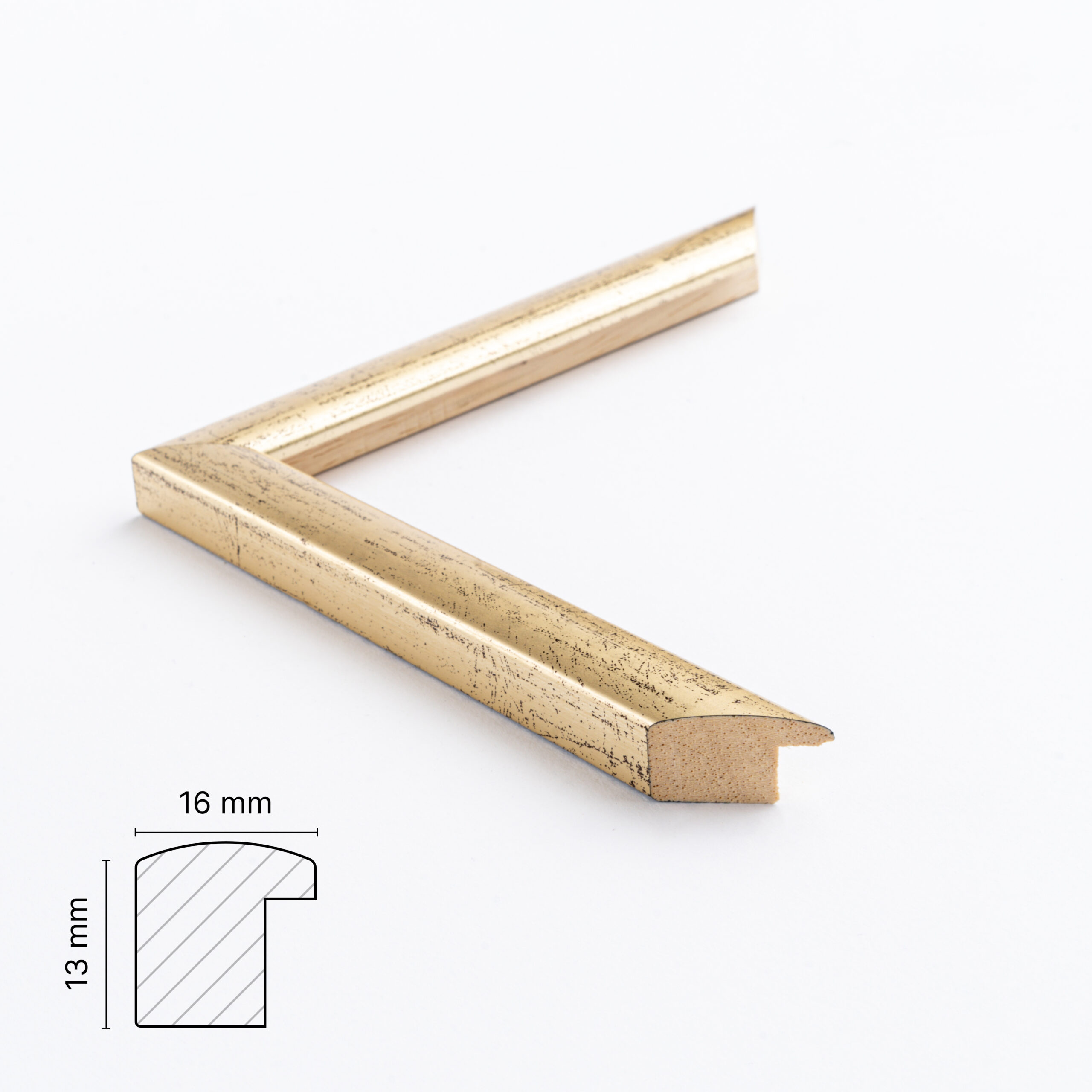 En Guld patina træramme med runde kanter er lakeret i en varm guldfarve med patina. Rammen er en smal tykkelse og måler 16 mm på forsiden og 13 mm i dybden. Rammen er fremstillet af Durian træ som så er malet og matlakeret.