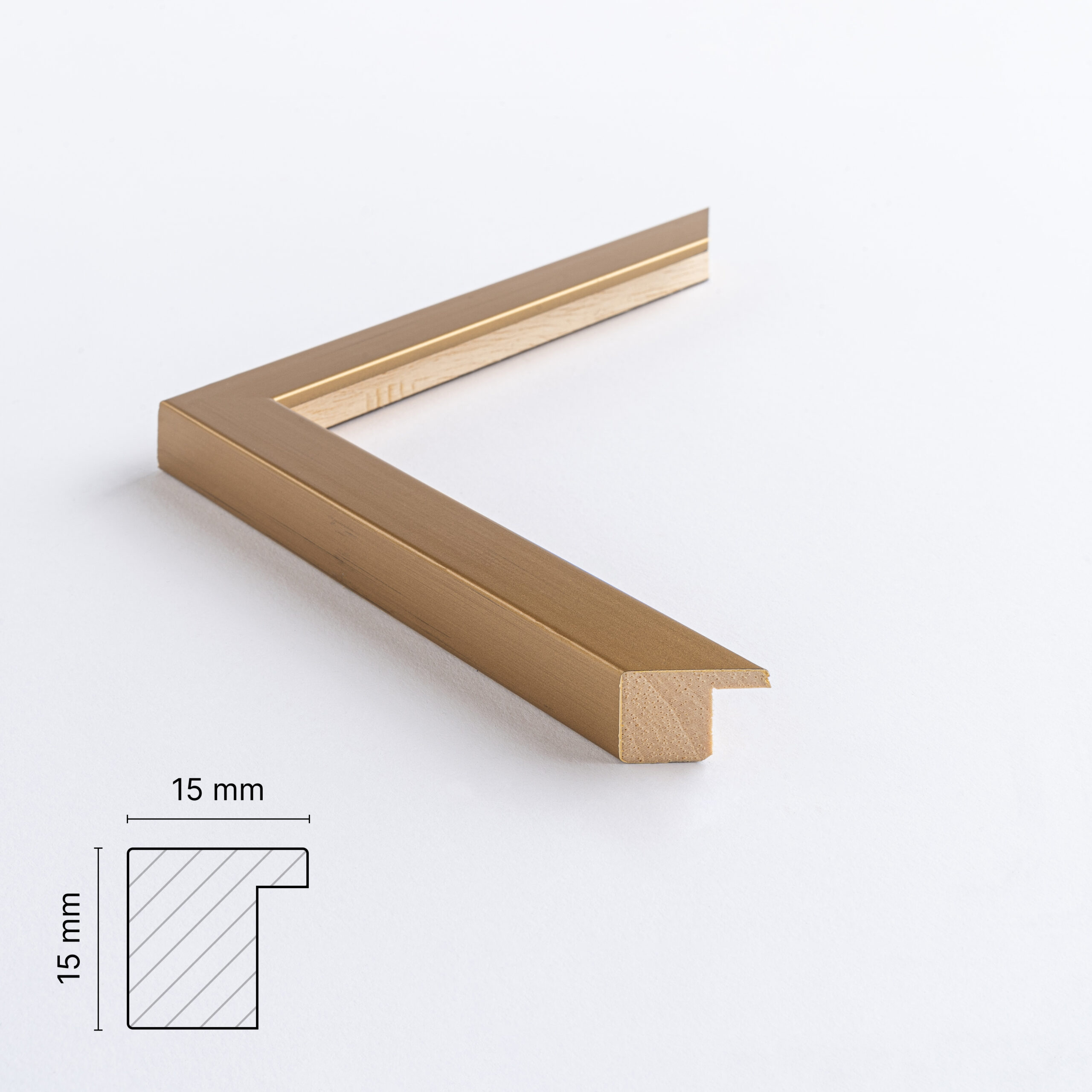 Denne rammeprofil som måler 15 mm på forsiden og 15 mm i dybden sælger vi til rammer i mange forskellige størrelser. Den smalle profil er flot til de små og mellemstore billeder – men er dit billede større end 50×70 cm skal du vælge en anden profil. Eksempelvis denne HER