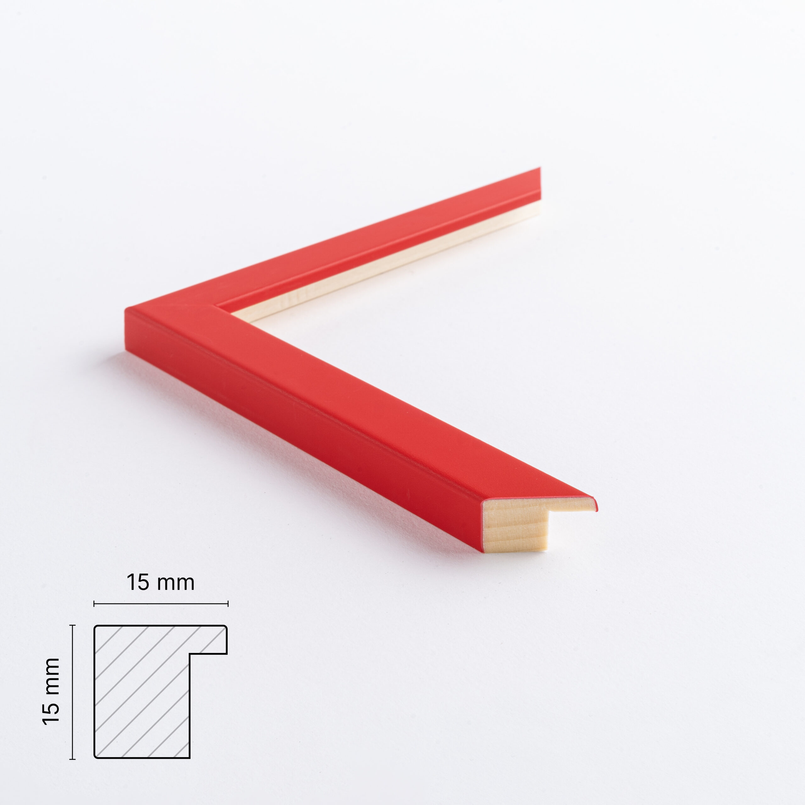 Denne rammeprofil som måler 15 mm på forsiden og 15 mm i dybden sælger vi til rammer de mindre rammer. Altså fra str. 50×70 cm og mindre.