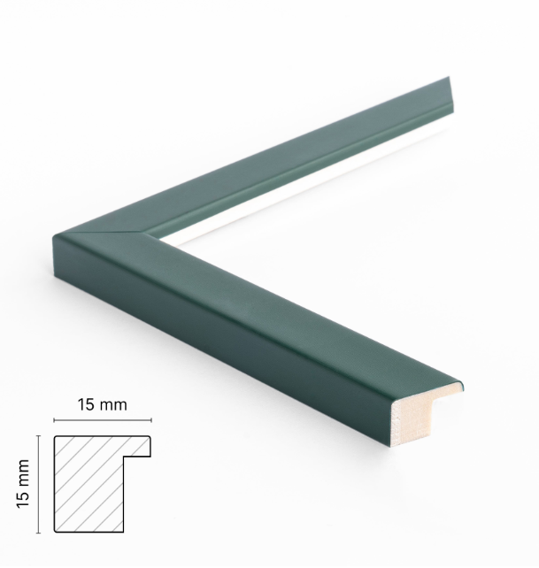 Kulørt mørkegrøn træramme.  Mat finish og bløde, firkantede lister. Rammen er en smal tykkelse og måler 15 mm på forsiden og 15 mm i dybden. Rammen er fremstillet af træsorten Durian. Det er en træsort der producerer frugt, og først efter 30-35 år fældes til brug for eksempelvis møbler og lister. Træet dyrkes oftest i plantager, så man hele tiden sikre, at man ikke bruger mere træ end der plantes.