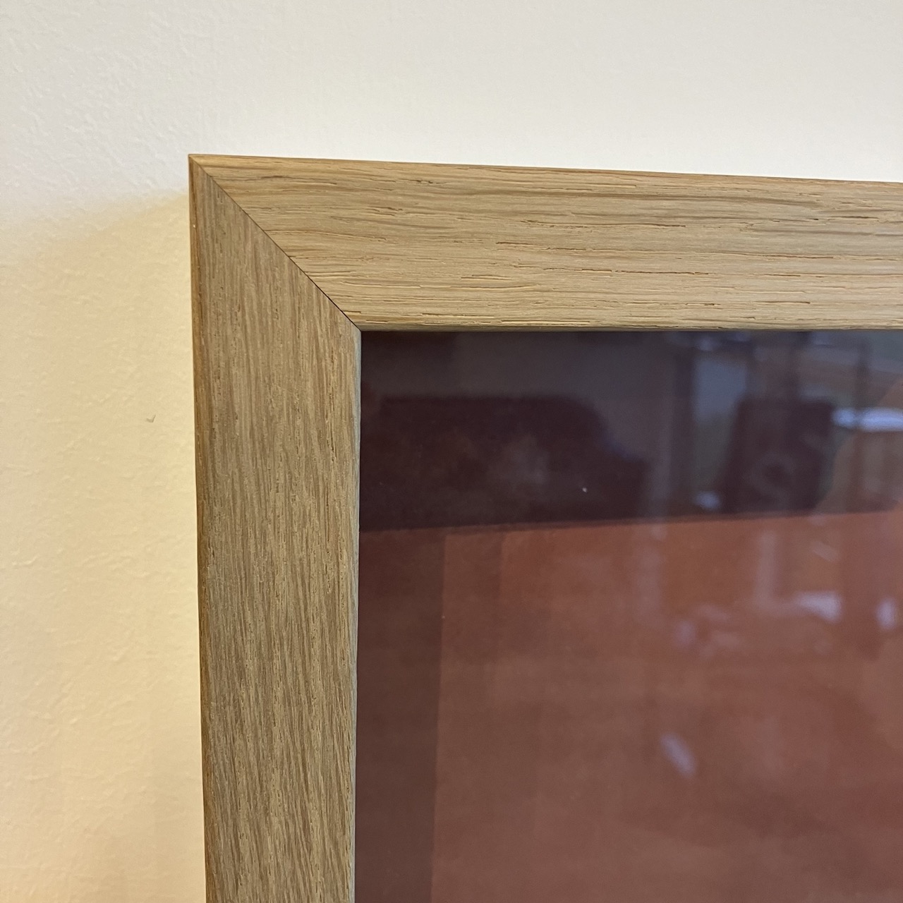 I rammen sidder ægte glas. Rammen kan både hænge på væggen – lodret eller vandret – efter dit ønske. Desuden er der et ben på rammen, så den også kan stå på en hylde eller et bord. Profilen måler 12 mm på fronten og 18 mm i dybden. Den kan bruges til rammer der måler op til A2 størrelse, men er proportionelt også pænt til de mindre billeder.