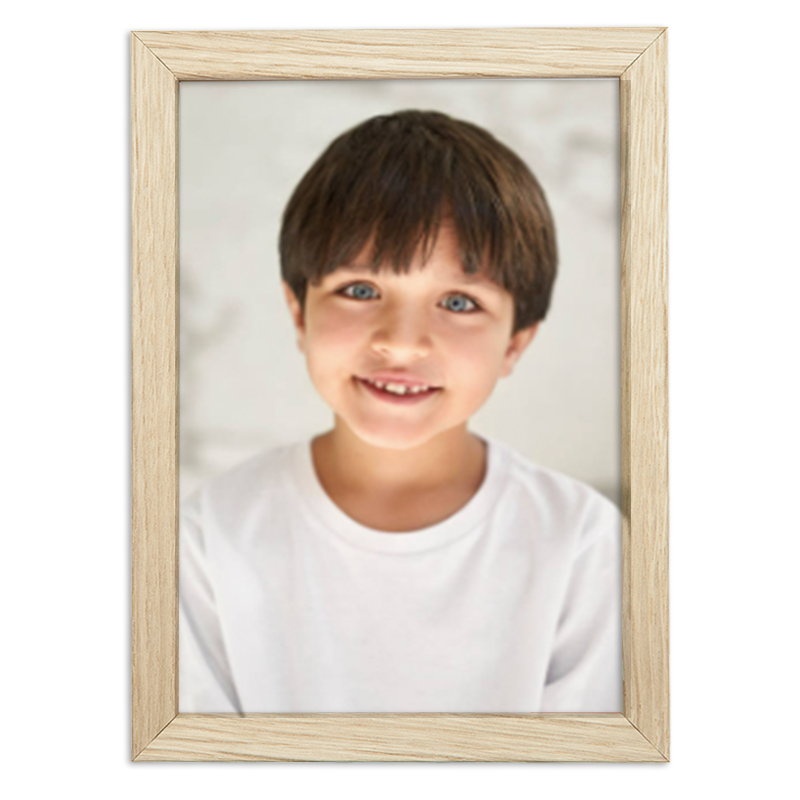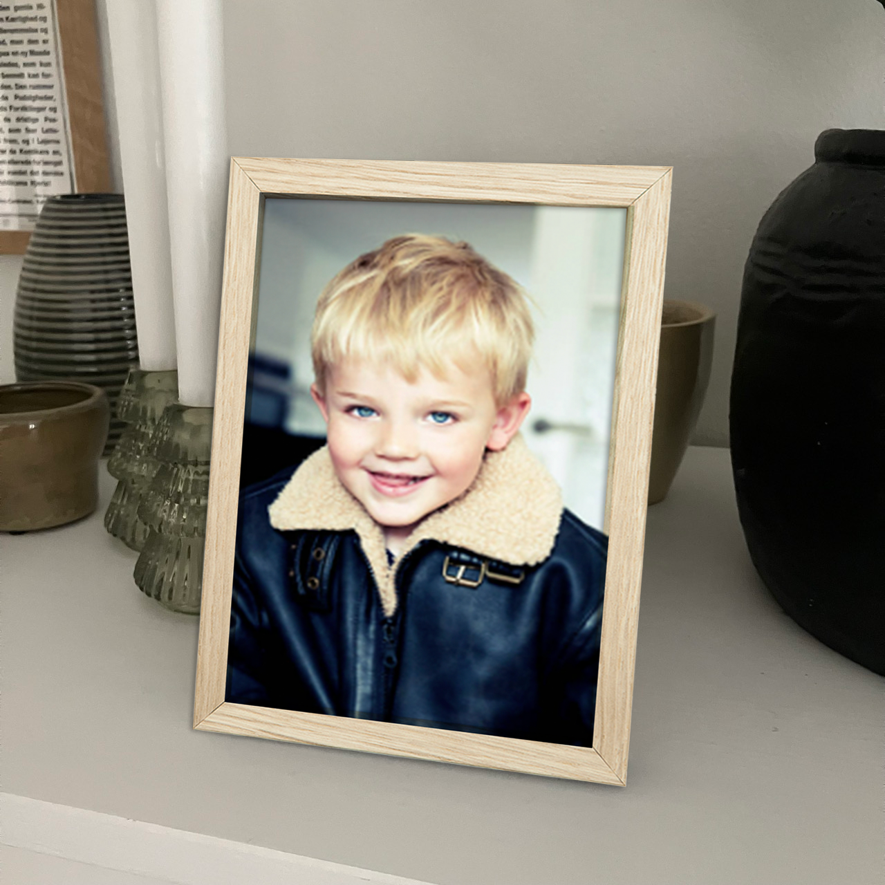 Har du fået bestilt et skolefoto i en af de små størrelser, er det en ramme som denne her du skal bruge. Det er en fin ramme, dansk produceret i lys egetræsfiner.