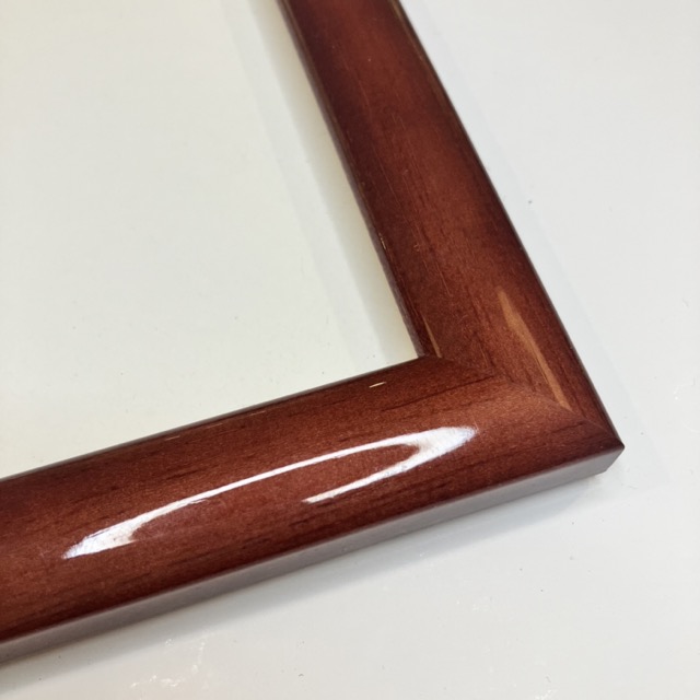 En dyb rødlig mahogni ramme i en højglans lakering. Den er med runde kanter og tydelige træårer under den tykke lak.